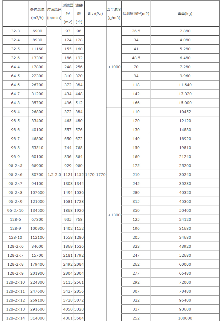 本系列產品共有33種規格,每室的袋有32、64、96、128袋四種,濾袋長度有2450mm和3060mm兩種,收塵效率可達99.9%以上,凈化后氣體的含塵濃度小于50mg/m3(標)本系列收塵器如用于寒冷地區,當室外采暖計算溫度≤-25℃時,要設熱裝置。